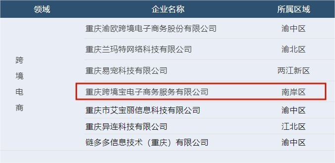 為找出符合重慶產(chǎn)業(yè)基礎(chǔ)的數(shù)字貿(mào)易特色領(lǐng)域、挖掘重慶本土數(shù)字貿(mào)易示范企業(yè)、營(yíng)造重慶數(shù)字貿(mào)易發(fā)展氛圍,近日,《2023年度重慶數(shù)字貿(mào)易50強(qiáng)榜單》在重慶服務(wù)貿(mào)易與數(shù)字協(xié)會(huì)年會(huì)上隆重發(fā)布,在較受關(guān)注的跨境電商領(lǐng)域,重慶跨境寶電子商務(wù)服務(wù)有限公司等7家企業(yè)榜上有名。